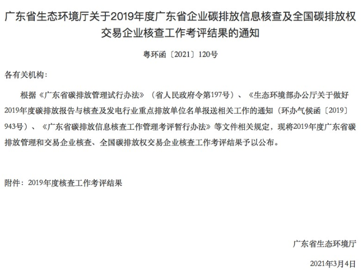 2021年3月4日,廣東省生態(tài)環(huán)境廳發(fā)布了《廣東省生態(tài)環(huán)境廳關(guān)于2019年度廣東省企業(yè)碳排放信息核查及全國(guó)碳排放權(quán)交易企業(yè)核查工作考評(píng)結(jié)果的通知》(粵環(huán)函〔2021〕120號(hào)),公布了廣東省生態(tài)環(huán)境廳2019年度廣東省企...