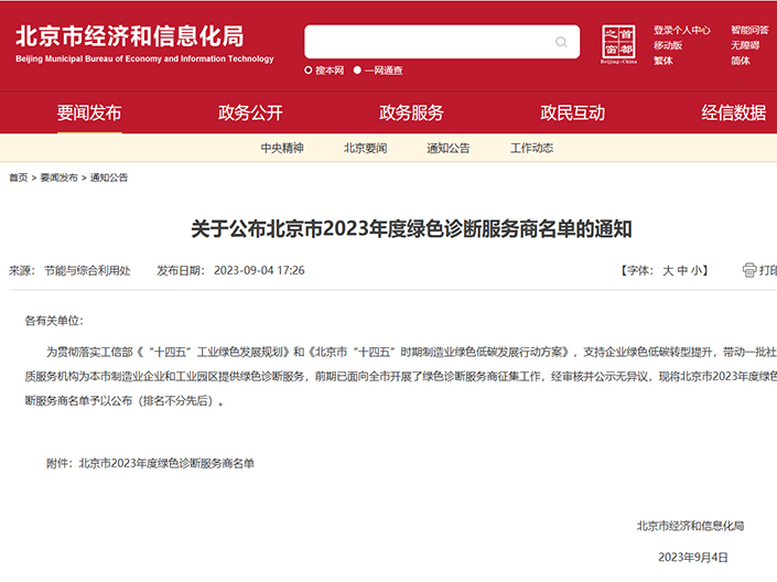 2023年9月4日,北京市經(jīng)濟和信息化局發(fā)布了《北京市經(jīng)濟和信息化局關于組織開展2023年度綠色診斷工作的通知》。經(jīng)審核,我司成功入圍北京市綠色診斷服務商,為在京規(guī)模以上制造業(yè)企業(yè)、工業(yè)園區(qū)及開發(fā)區(qū)提供綠色診斷...