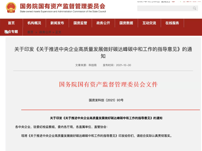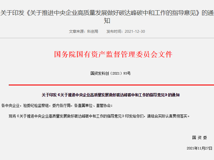 國(guó)務(wù)院國(guó)資委30日對(duì)外發(fā)布《關(guān)于推進(jìn)中央企業(yè)高質(zhì)量發(fā)展做好碳達(dá)峰碳中和工作的指導(dǎo)意見(jiàn)》,明確了中央企業(yè)做好碳達(dá)峰碳中和工作的總體要求與主要目標(biāo)。指導(dǎo)意見(jiàn)明確,要把碳達(dá)峰碳中和納入國(guó)資央企發(fā)展全局,著力布...