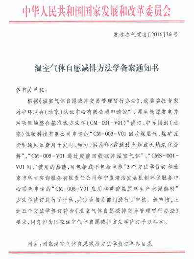 《溫室氣體自愿減排方法學(xué)備案通知書(shū)》(發(fā)改辦氣候備[2016]36 號(hào)):